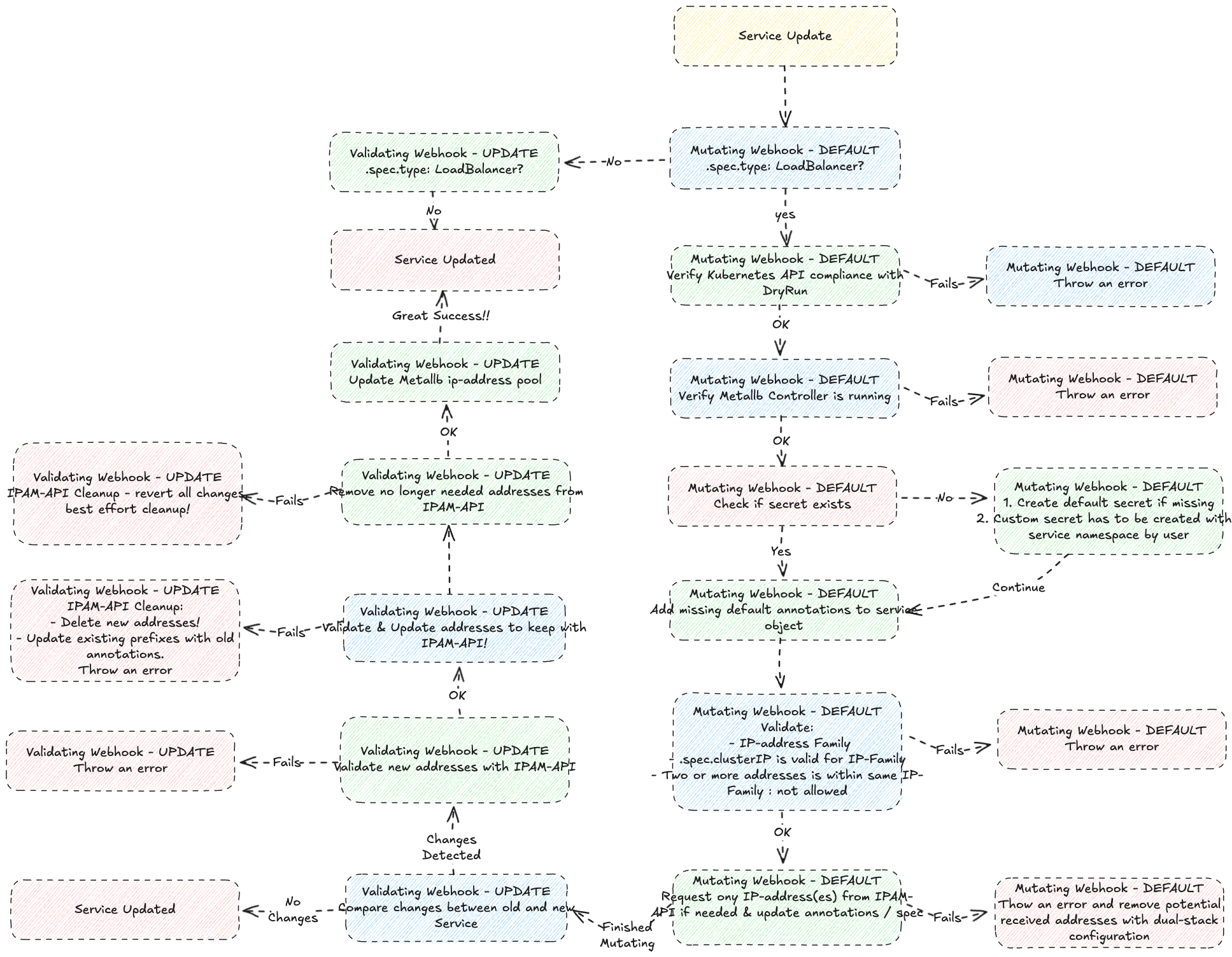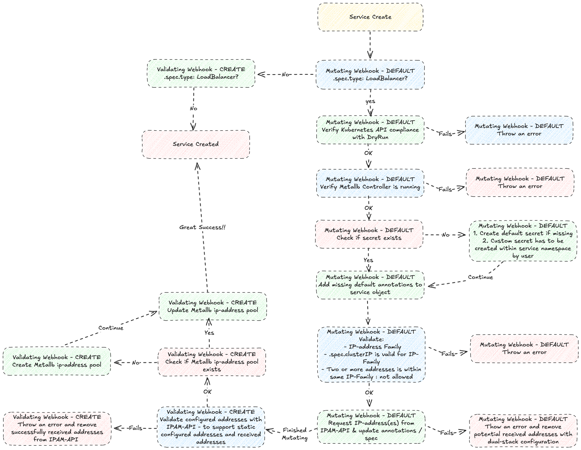 If kubernetes API is happy with dryRun - f.ex all required kubernetes parameters is valid - the service will be populated with all required default annotations through IPAM-operator.